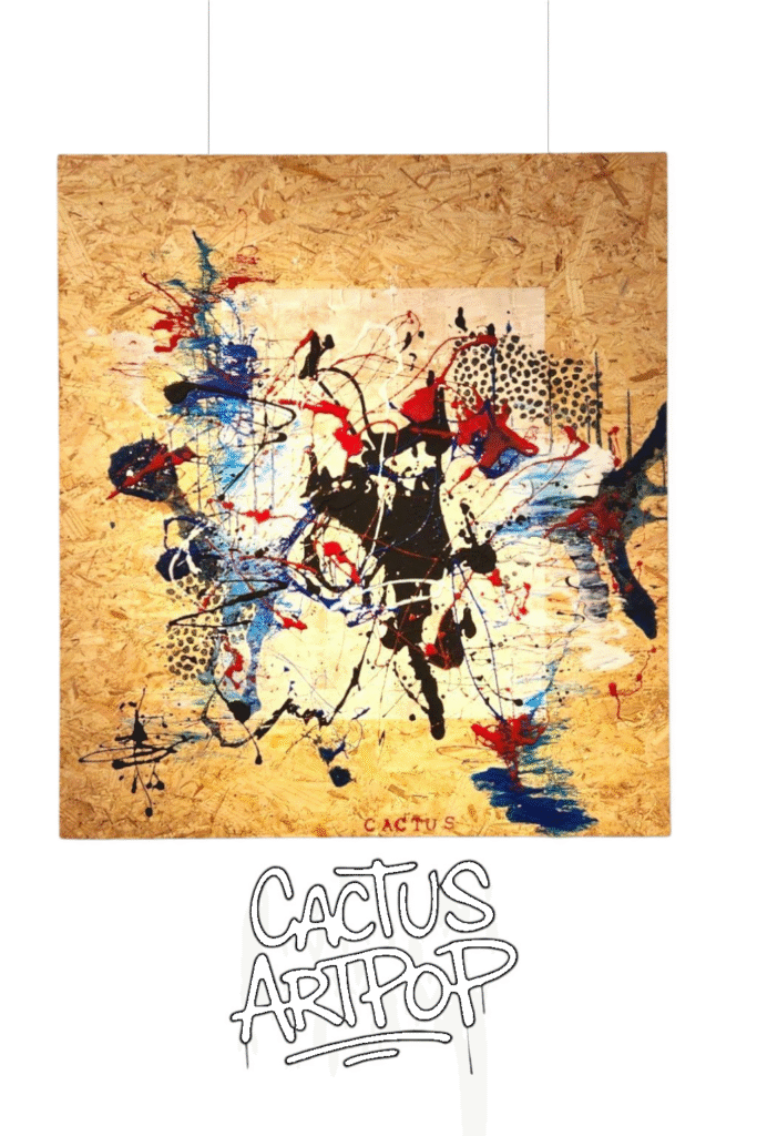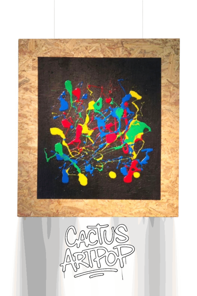 black paint splatters. Painted on raw OSB wood.