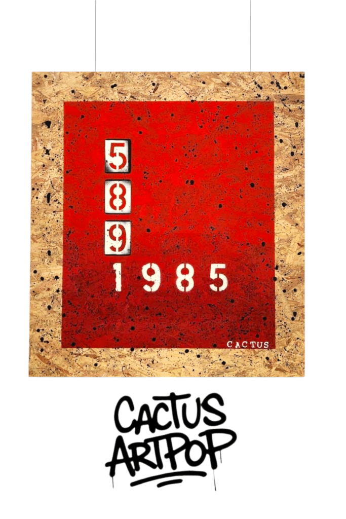 year 1985, layered with stenciled numbers and