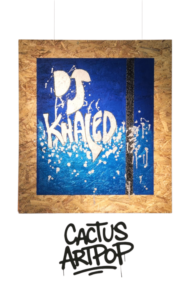 A bold mixture of Blue and silver in a tribute to DJ Khaled, this piece fuses music,street culture, and explosive visuals.